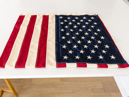 Enhance your home decor with the Vintage Americana Flag with Grommets. This stunning flag embodies patriotic spirit and timeless charm, perfect for seasonal displays.