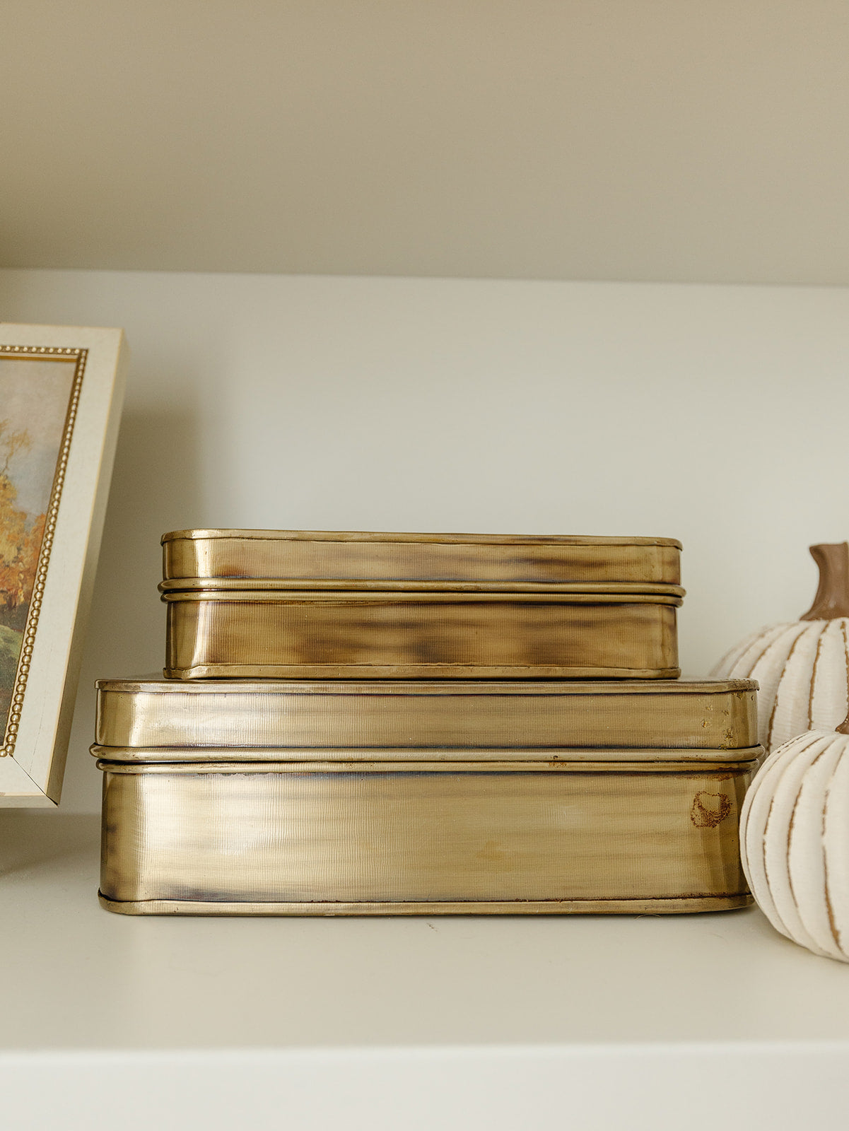 Set of 2 Antique Brass Metal Boxes adds vintage charm and modern elegance to any room. Perfect for jewelry, trinkets, or decor accents.