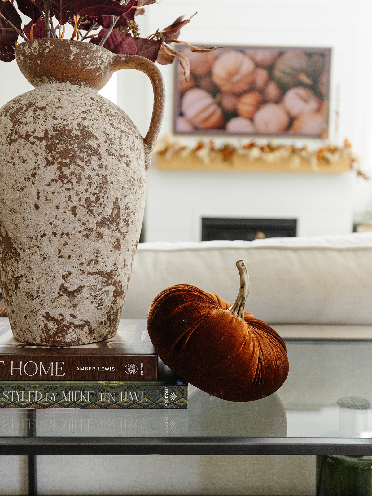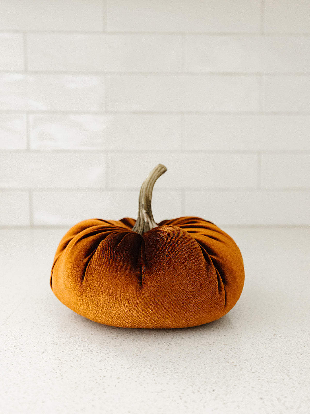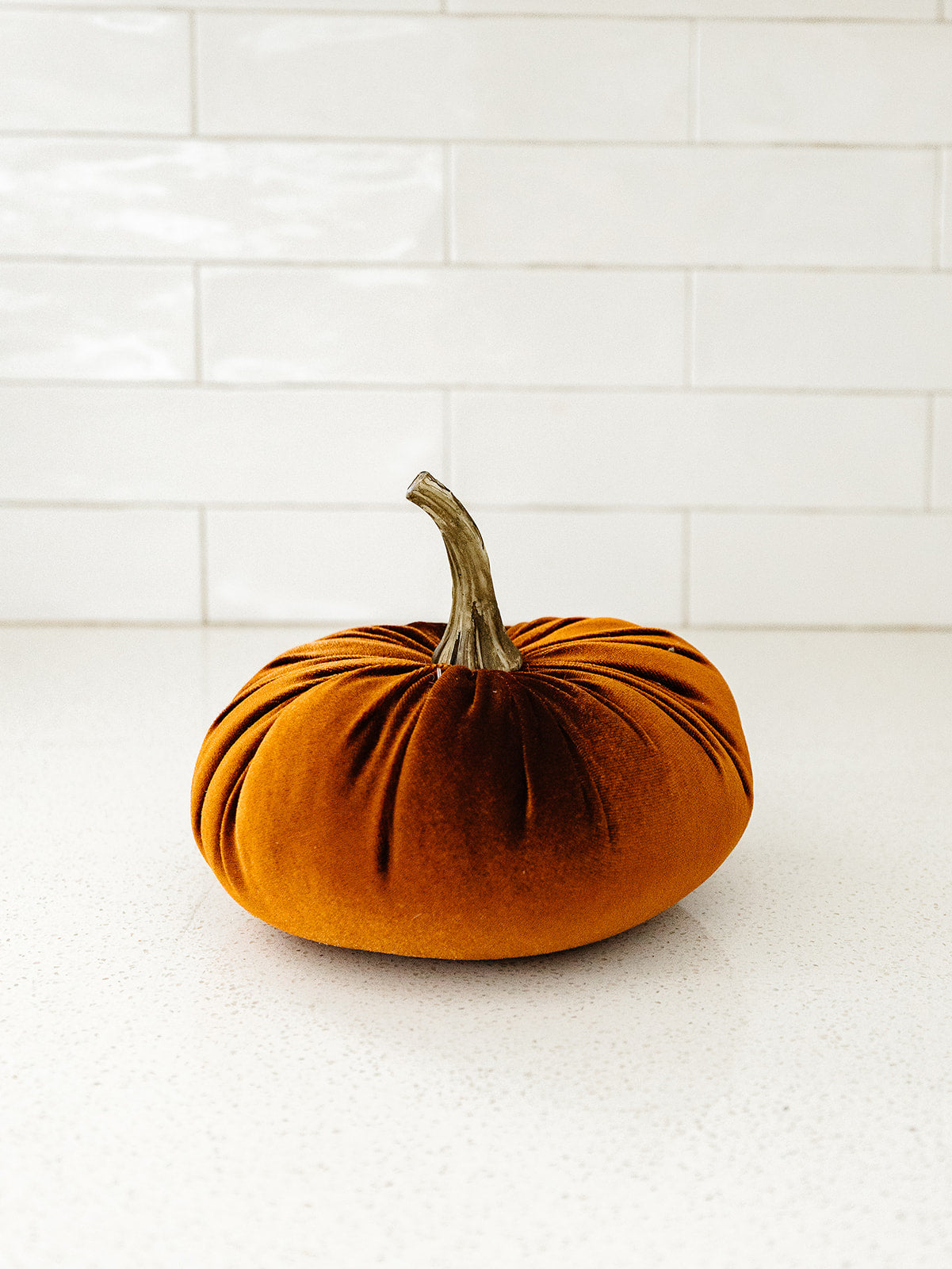 Elevate autumn decor with this soft rust velvet pumpkin. Its rich color brings warmth and elegance, perfect for centerpieces and mantel displays.