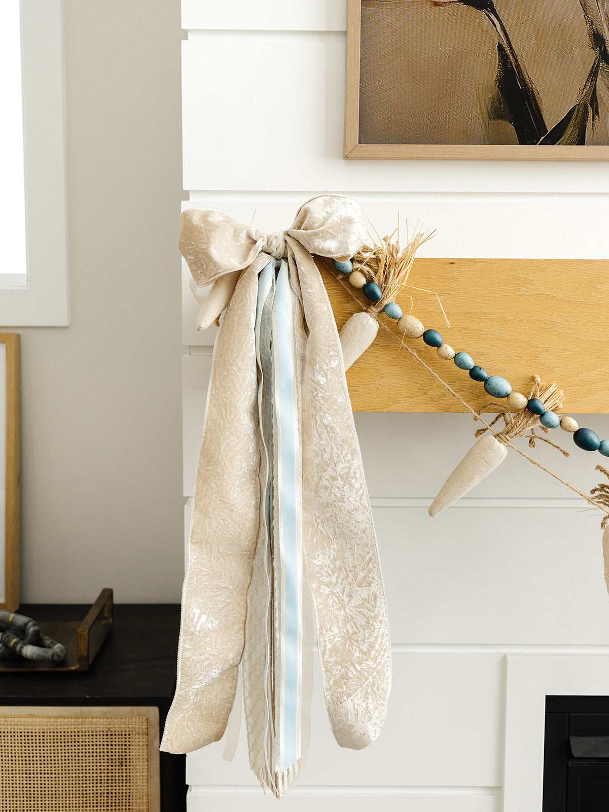 Elevate your holiday and seasonal decor with these meticulously crafted Fireplace Ribbon Bundles. Sold in sets of two as shown, these bundles are designed to bring rich texture and vibrant color to your mantelpiece or fireplace area, without the distraction of additional garlands like egg and carrot accents. Approximately 16" in Length.