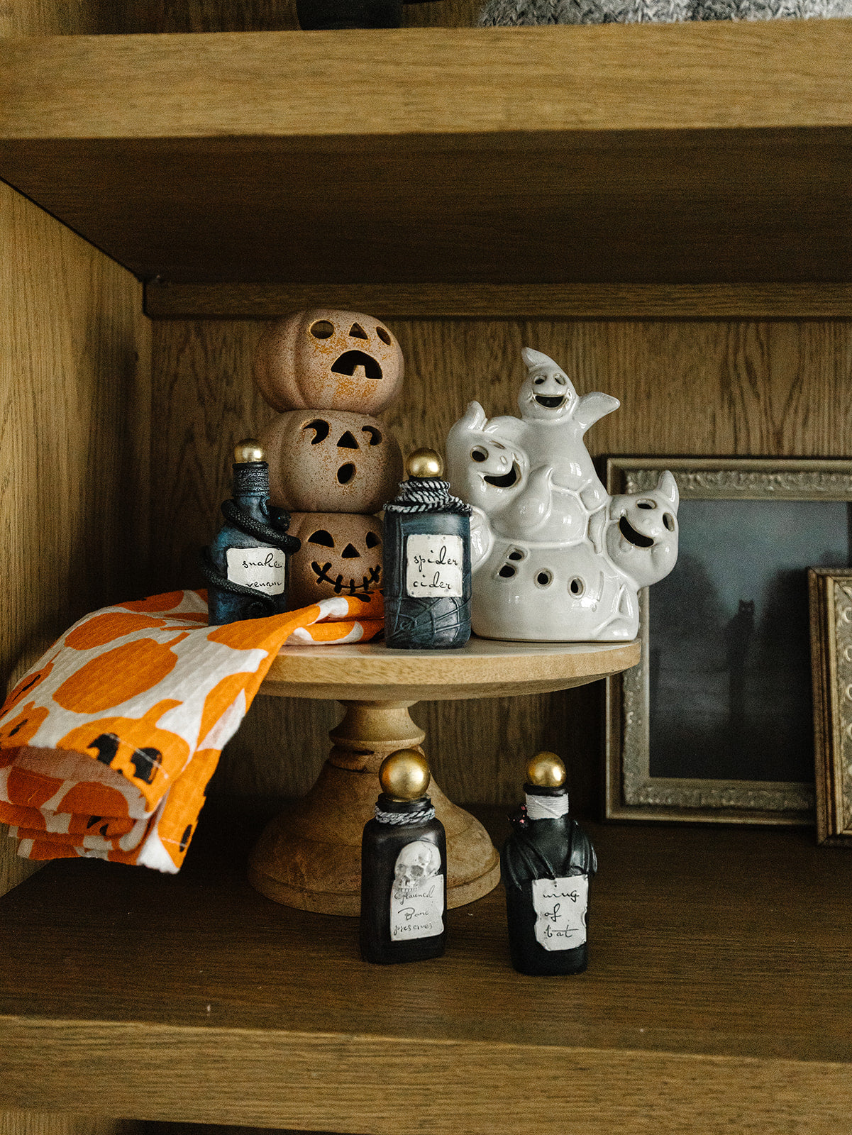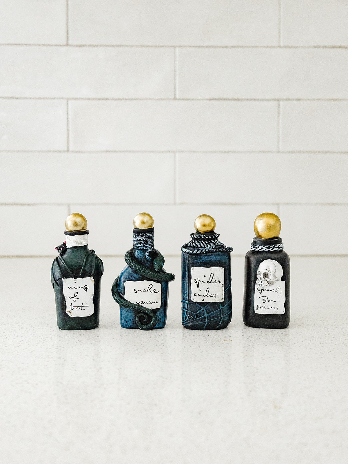 Mini Potion Bottles - Set of 4 add a whimsical touch to any space. Perfect for Halloween or everyday decor, these charming bottles brighten up your home effortlessly.