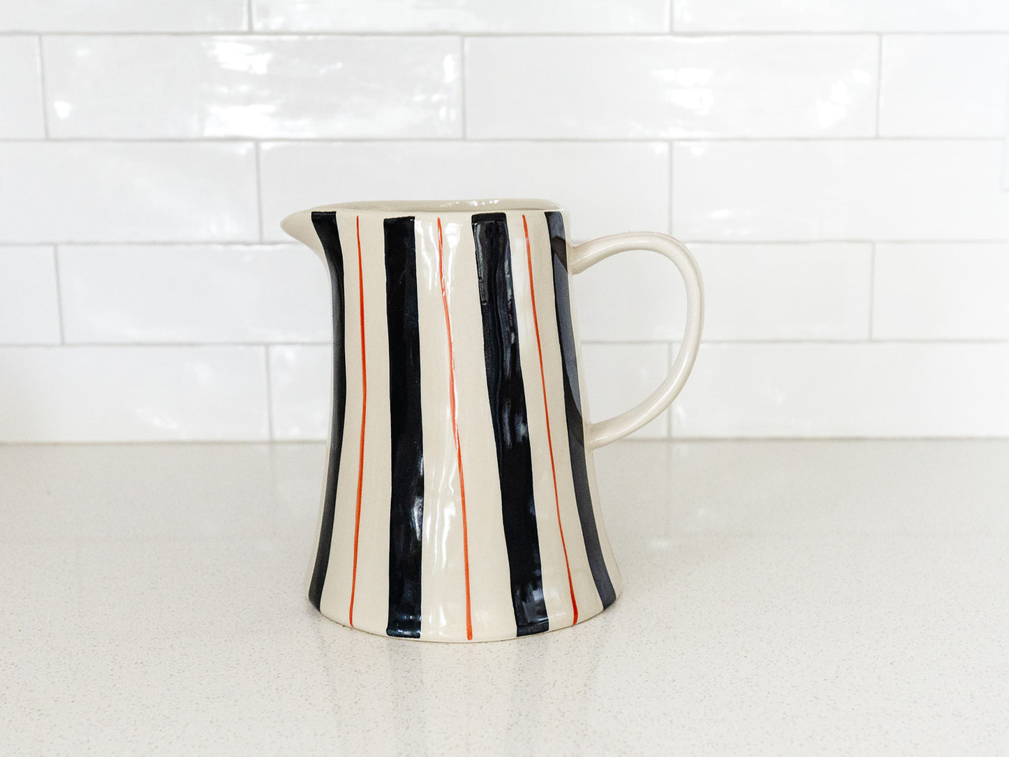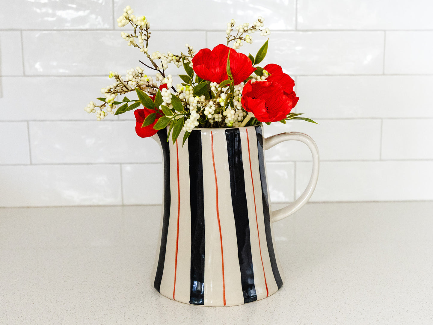 Elevate your kitchen decor with our Red and Blue Striped Pitcher. Perfect for serving beverages or as a charming decorative piece, its vibrant colors add a touch of seasonal flair to your home.