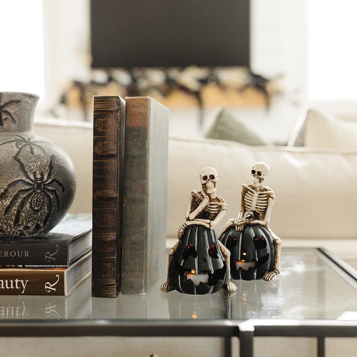 Illuminate your Halloween with the Skeleton on Jack o Lantern LED, featuring 3 spooky styles. Perfect for eerie home decor ambiance!